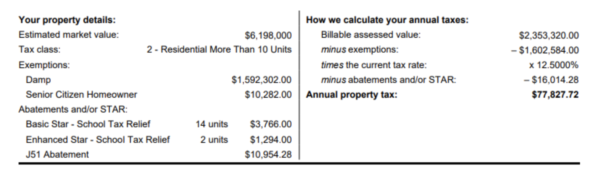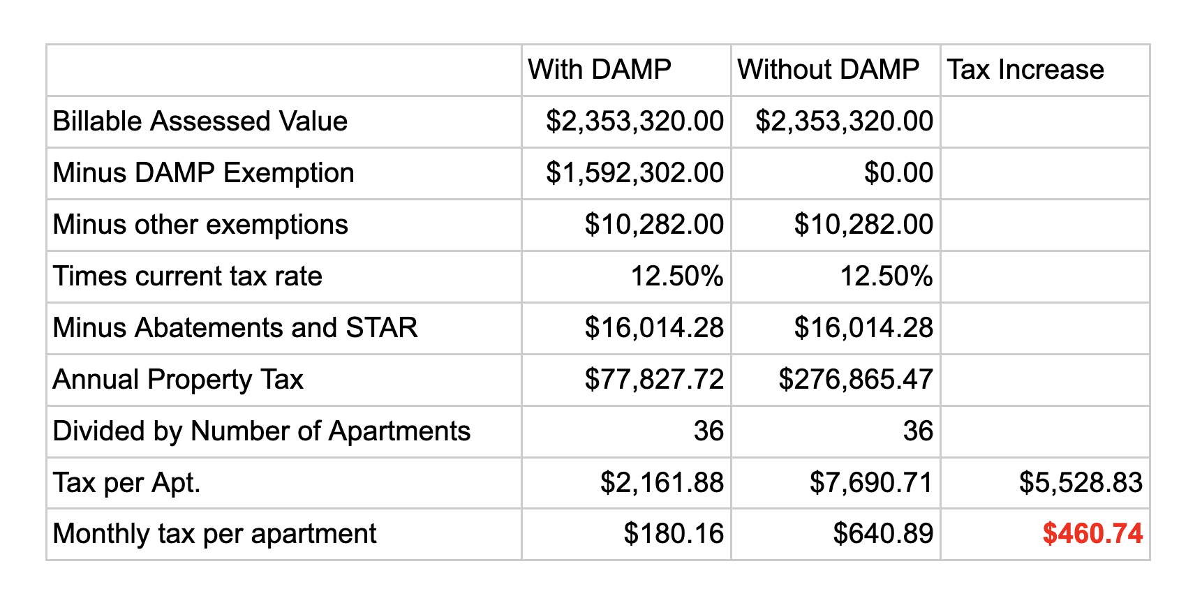 7 – To see what your taxes would be like without a DAMP exemption, remove the exemption from the column on the right, and divide by the number of units in your building to get the annual real estate taxes per apartment. Those taxes are included in your monthly maintenance bill.